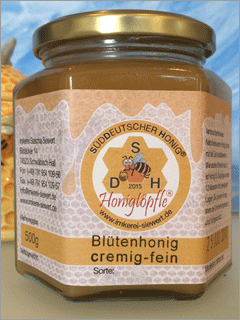 Blütenhonig cremig-fein Unser Blütenhonig cremig-fein weist dieselben Eigenschaften wie unser Blütenhonig auf, nur mit dem Unterschied, dass das Herstellungsverfahren leicht variiert. Der Blütenhonig cremig-fein wird im Unterschied zum gewöhnlichen Blütenhonig mehrere Tage lang cremig gerührt, bis er seine unverwechselbare feste Konsistenz erhält. Preis pro kg: 12,00 € |
