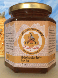 Edelkastanienhonig Farbspektrum reicht von braun, rotbraun bis dunkelbraun. Kräftig-herb im Geschmack, leicht bitter. Hoher Fruktosegehalt und zähflüssig, daher langsames Kristallisieren. Der Edelkastanienhonig wird aus dem Nektar der zumeist männlichen, kerzenartigen Blütenständen gewonnen und enthält neben Pollen viele Enzyme und Inhibine - Hemmstoffe zur Bekämpfung schädlicher Bakterien - was ihn bei Durchblutungsstörungen gut einsetzbar macht und allgemein die körpereigene Abwehr stärkt. Preis pro kg: 14,00 € |